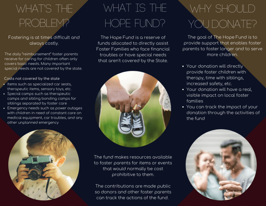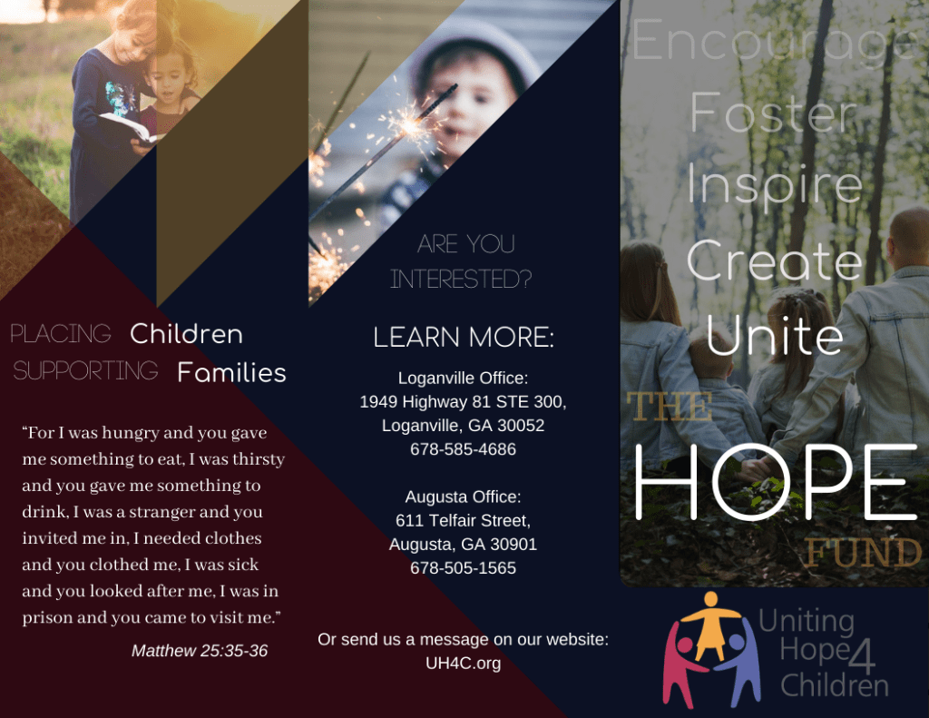 Working with the foster care Uniting Hope 4 Children, my phenomenal team created one video and one brochure for them to use to advertise their service The Hope Fund.